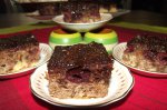 Am folosit o tava cu dimensiunile de 34/22 cm tapetata cu hartie de copt. Visinele le-am pus la scurs. Am prajit si tocat grosier nuca. Dupa ce s-au scurs visinele, le-am pus in tava si am taiat untul cubulete, am bagat tava la cuptor pentru 6 min, apoi am scos tava si am presarat nuca...