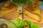 Asezam cate o felie de cascaval afumat Hochland pe feliutele unse, decoram cu mustar frantuzesc.