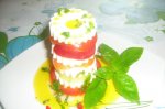 Asezam o felie de rosie, apoi una de miez de lapte, una de ardei, alt miez de lapte, din nou ardei (dar de alta culoare), iar miez de lapte ... in acest mod cladim un turnulet cat sa nu se...