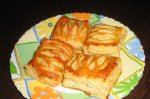 Ungem fiecare bucata de foietaj pana la jumatate cu crema Ceva Fin, cealalta jumatate o crestam, vezi foto.
