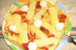 Scoatem tava din cuptor, pe fiecare felie punem cate o lingura de cubulete de rosii din conserva.