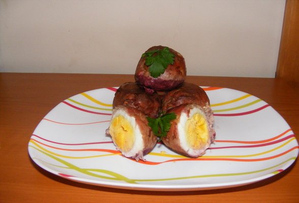 Ouă înfăşurate în muşchi de porc