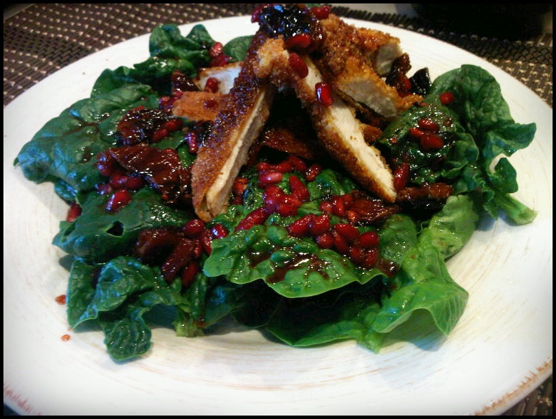 Salata de spanac cu balsamic cald si pui pane